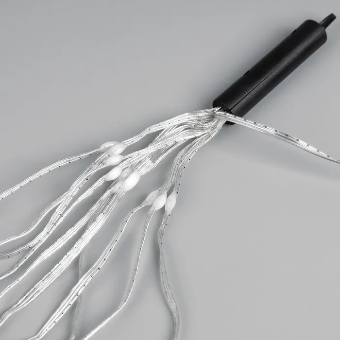 Конский хвост. Эффектная гирлянда в виде пучка светодиодных нитей, соединённых в одном основании, свободно свисающих вниз. Этот вид напоминает Ip 20. Устройство защищено от твердых объектов диаметром больше 12,5 мм и не защищено от проникновения воды. Цвет свечения можно настроить с помощью приложения или пульта