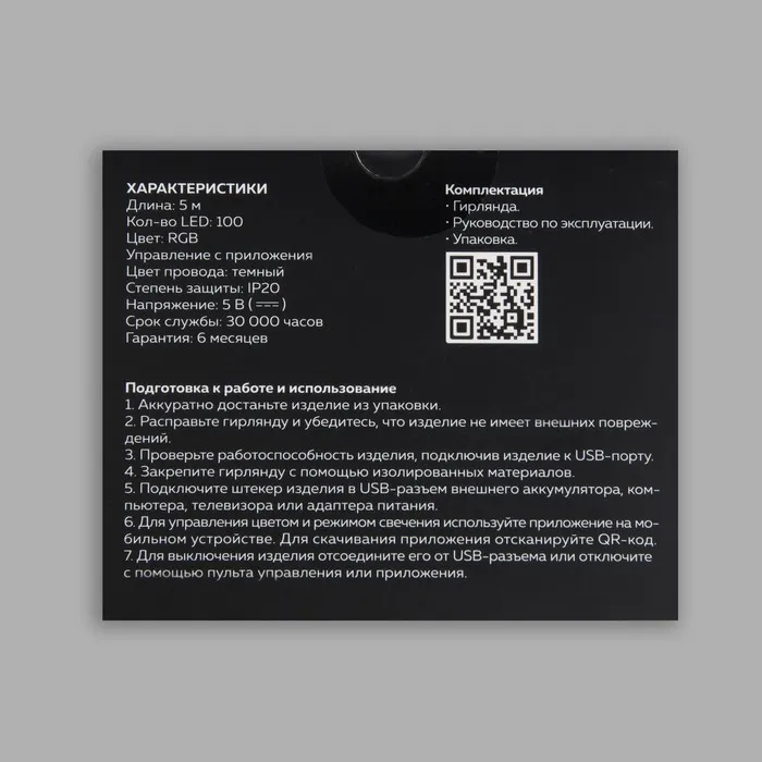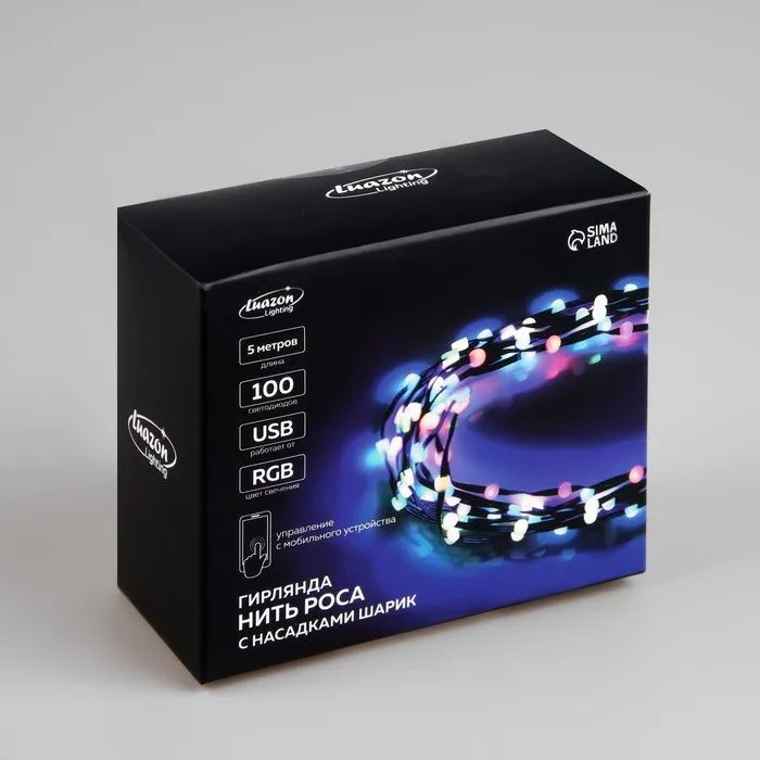 Умная гирлянда «Нить» 5 м роса с насадками «Шарики», IP20, черный провод, 100 LED, пульт ДУ, приложение, свечение RGB, USB — Характеристики