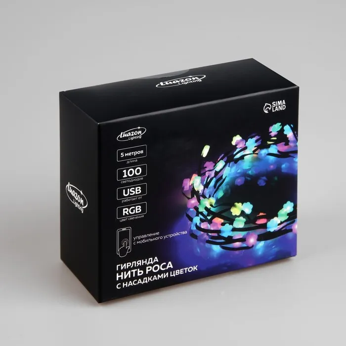 Умная гирлянда «Нить» 5 м роса с насадками «Цветочки», IP20, тёмная нить, 100 LED, пульт ДУ, приложение, свечение RGB, USB — Характеристики