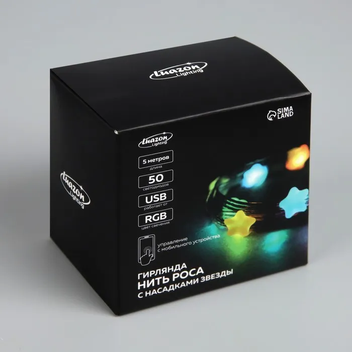 Умная гирлянда «Нить» 5 м роса с насадками «Звёздочки», IP20, серебристая нить, 50 LED, пульт ДУ, приложение, свечение RGB, USB — Характеристики