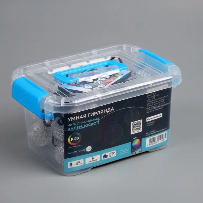Умная гирлянда «Нить» 6 м с насадками «Калейдоскоп», IP20, тёмная нить, 20 LED, свечение RGB, USB — Характеристики