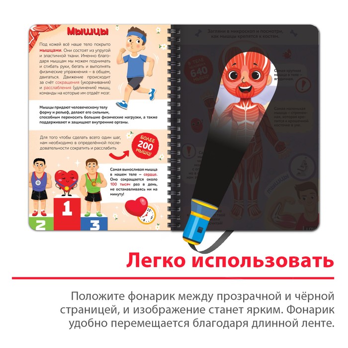 С умной книжкой «Моё тело» ребёнок узнает, как устроен человеческий организм и как работают все наши органы и системы. Выполняйте задания, ищите подсказки с помощью фонарика и узнавайте много нового вместе с малышом.