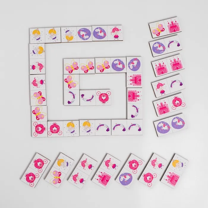 Участвуют от 2 до 4 человек. Если игроков двое, они получают по 7 фишек, если больше — по 5. Начинайте выкладывать элементы с дублей, а затем по очереди все участники должны добавлять с любого края совпадающие по картинке фишки. Если подходящих не оказалось, дополнительная берётся из «банка», пока не найдётся нужная, или пропускается ход. Побеждает тот, кто быстрее всех выложит все свои фишки.