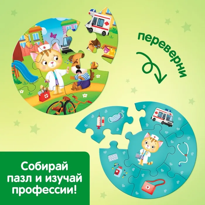 Двусторонние пазлы «Мир профессий» — это увлекательный способ познакомить ребёнка с разнообразием взрослых занятий через игру. В набор входит 5 круглых пазлов, состоящих из 30 элементов, где каждая сторона раскрывает новые детали о профессиях. Собирая эти пазлы, малыш развивает внимание, логическое мышление и мелкую моторику.