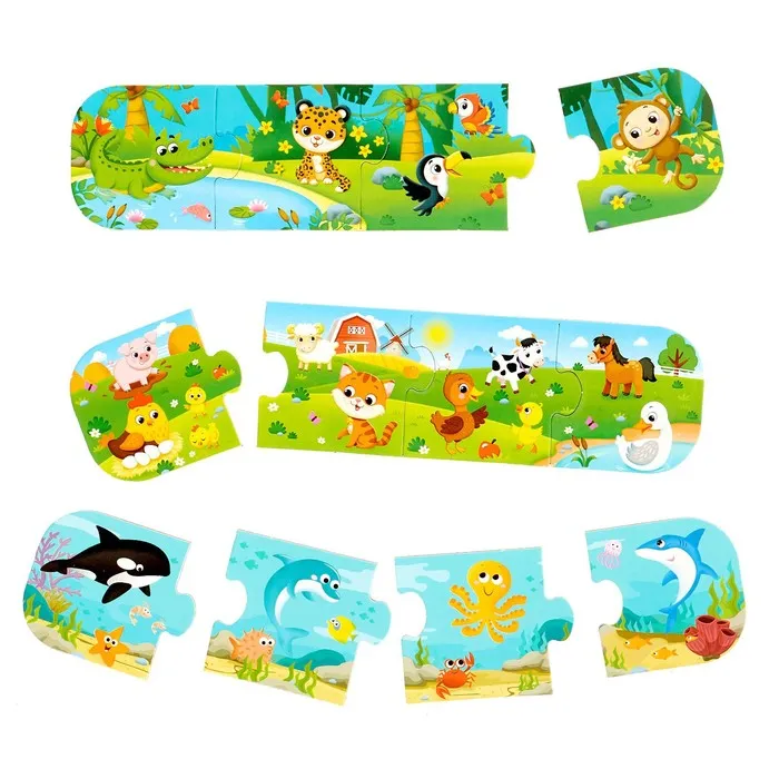 Умные пазлы «Животные» — это не просто пазл, а настоящая игра-головоломка! Ребёнок познакомится с разными животными, распределит их по средам обитания, и узнает, где они обитают.