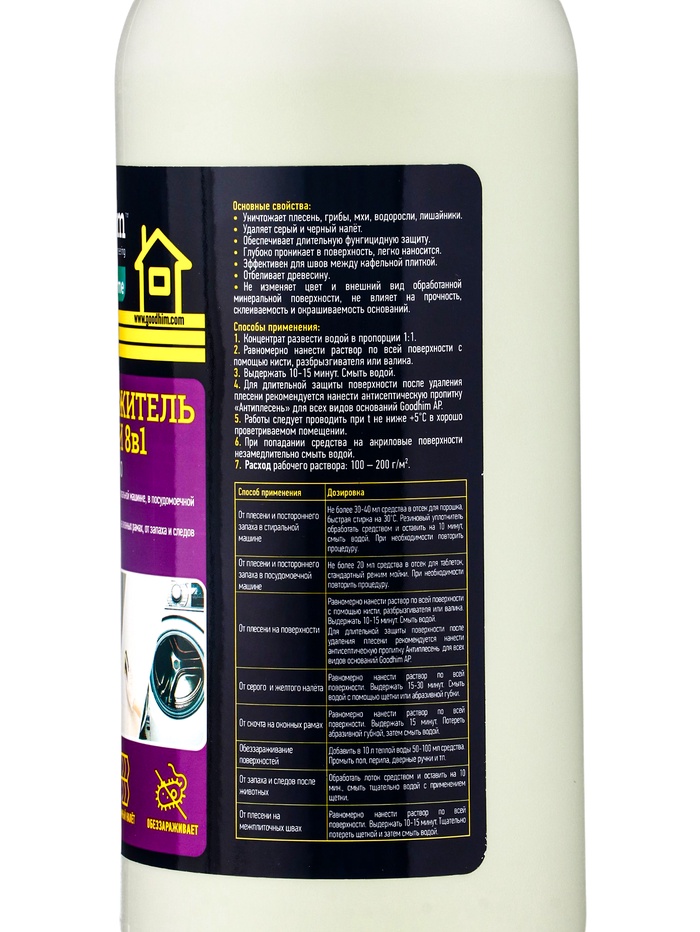 - 8 в 1: очищает, дезинфицирует, удаляет плесень и грибок, устраняет запах, препятствует повторному заражению;