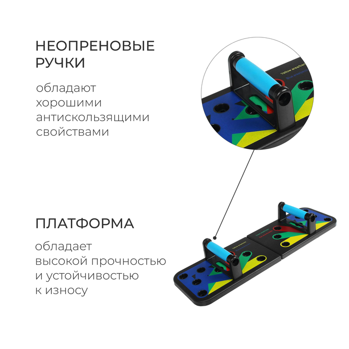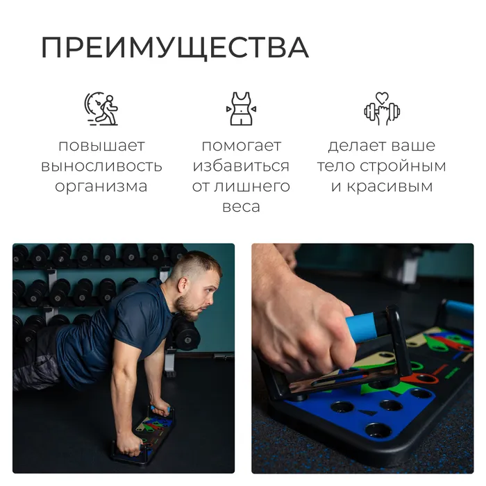 Платформа для отжиманий — это эффективный и удобный аксессуар для домашнего использования, который позволяет укреплять и развивать мышцы рук, груди и тренировать мышцы плечевого пояса. Систематические занятия с использованием упоров для отжимания повышают выносливость организма, помогают избавиться от лишнего веса, делают ваше тело стройным и красивым.
