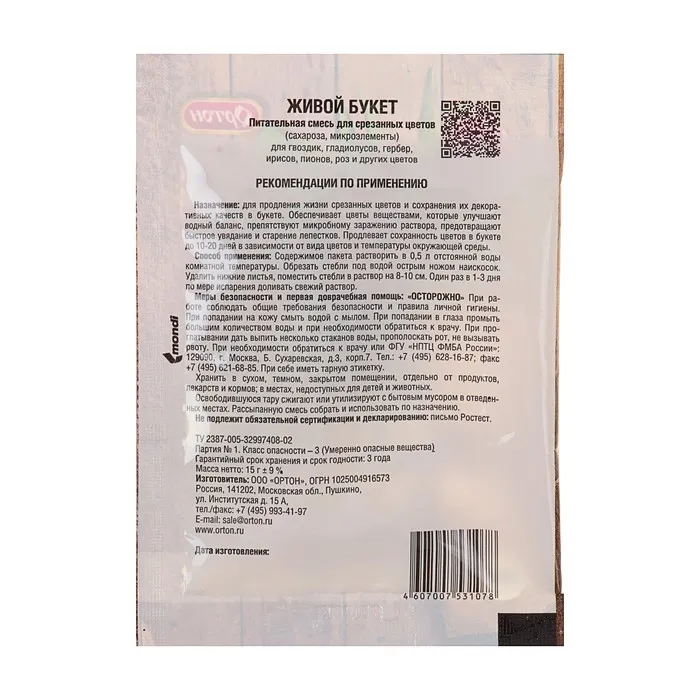 Универсальная подкормка для срезанных цветов "Живой букет", Ортон, 15 г — Характеристики