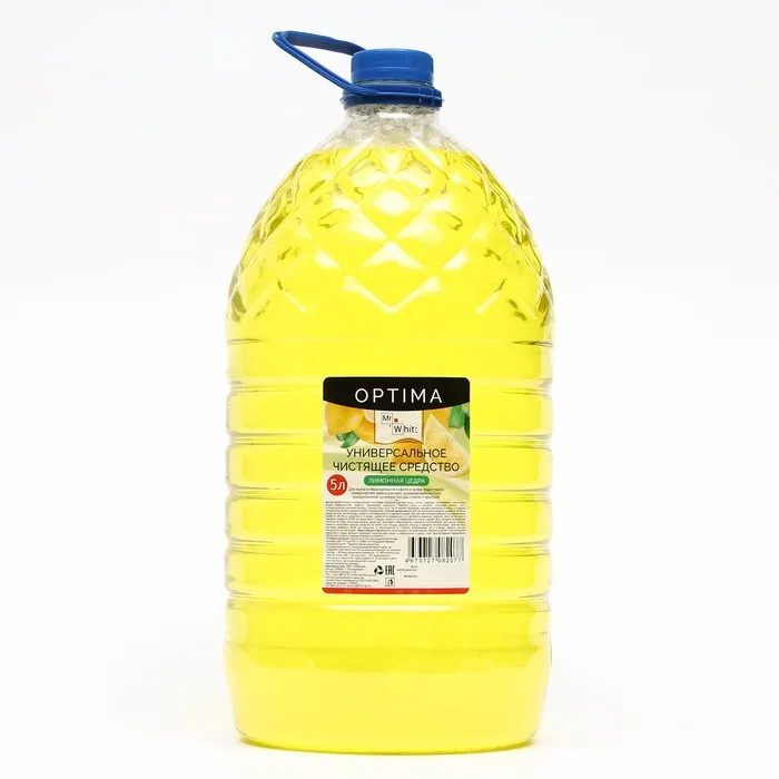 Высокоэффективное универсальное чистящее средство Mr. White Optima Лимонная цедра 5 л. Удаляет пыль, грязь, жировые загрязнения с различных видов поверхностей: кафеля, линолеума, ламината, паркета, ванн и раковин, кухонной мебели, плит, холодильников, кухонной посуды, стекла и хрусталя. Не оставляет разводов, придает поверхности блеск, устраняет неприятные запахи, ароматизирует помещение. Для сильных загрязнений нанести на губку несколько капель средства, протереть поверхность и промыть теплой водой.