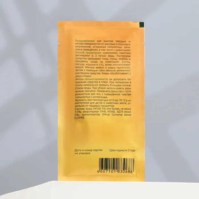 Предназначено для очистки твёрдых и мягких поверхностей от жировых и белковых загрязнений, устранения неприятных запахов в помещениях, в том числе с животными.