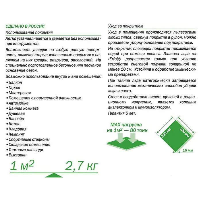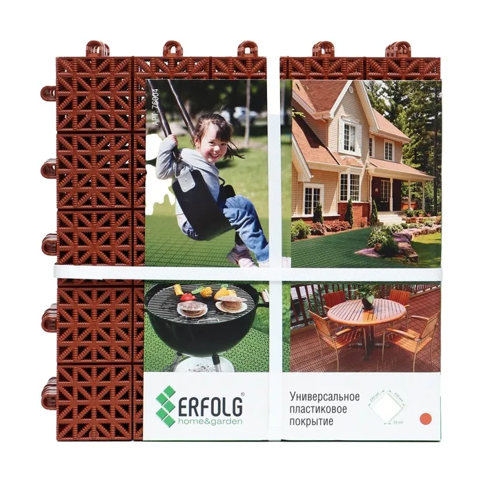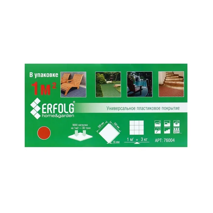 Покрытие ERFOLG H&G эластичное и прочное, устойчиво к механическим, температурным и климатическим воздействиям и нагрузкам. Его можно использовать как на улице, так и внутри помещений в силу высокой сопротивляемости бактериям и грибкам. Каждый модуль обладает эффектом подвижного замка и скосом, что позволяет выкладывать площадки любых размеров и не бояться деформации покрытия.