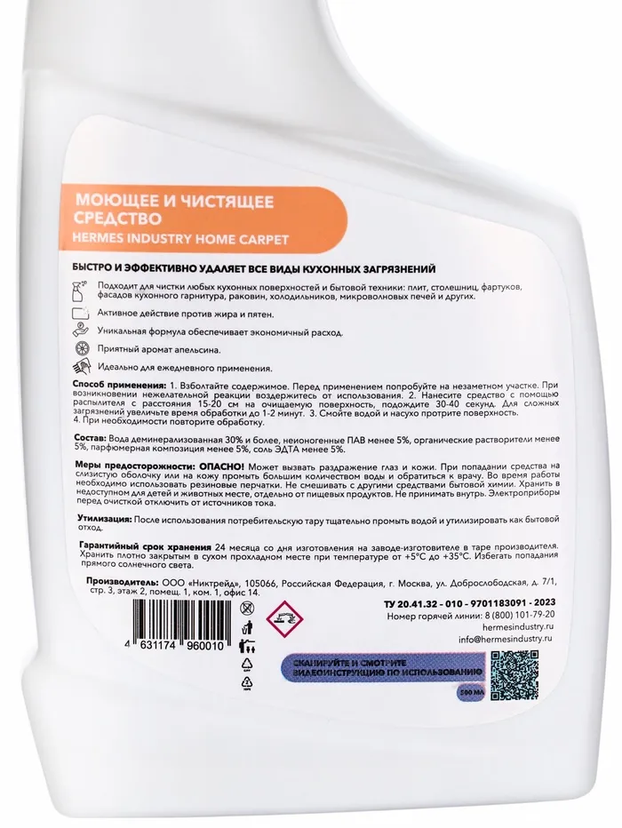 Универсальное средство для кухни Hermes Industry HOME, спрей, 500 мл — это идеальное решение для быстрого и эффективного очищения всех поверхностей на вашей кухне. Разработанное для того, чтобы справляться с любыми загрязнениями, это средство идеально подходит для использования на плитах, столешницах, кухонных поверхностях, раковинах, а также для очищения дверей холодильников, микроволновок и других приборов.