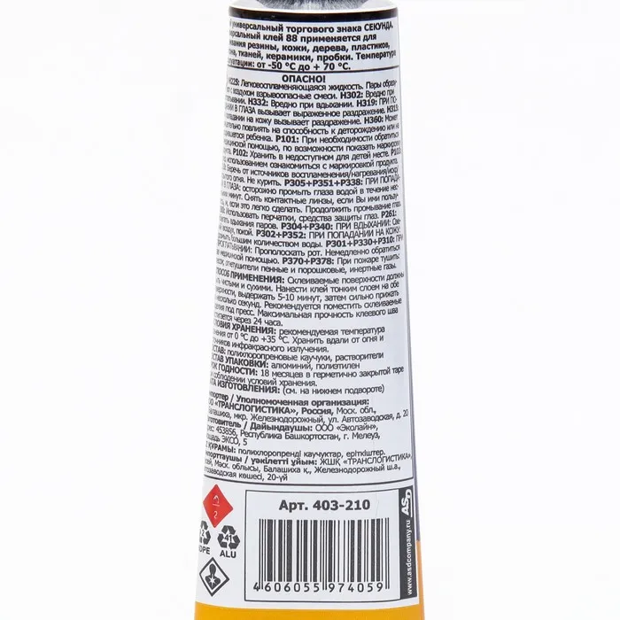 Универсальный клей Секунда 88 особо прочный водостойкий, 30мл 403-210 не содержит толуола.