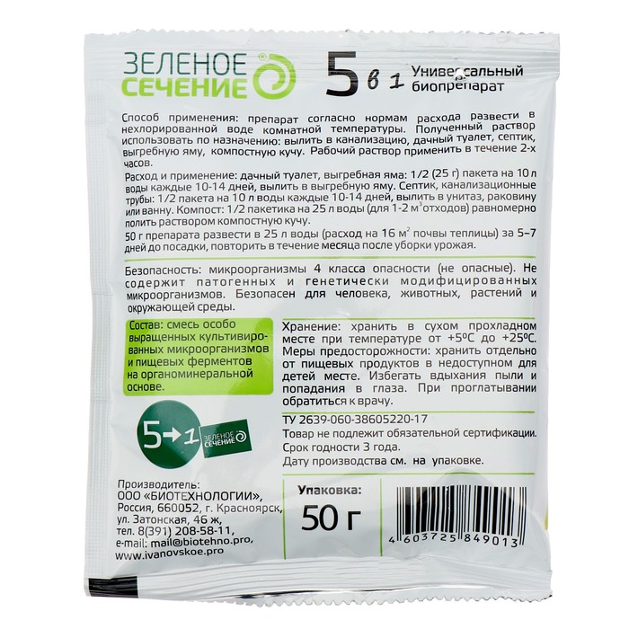Универсальный биопрепарат 5 в1, для теплиц, септиков, компостов, дачных туалетов, 50 г — Характеристики