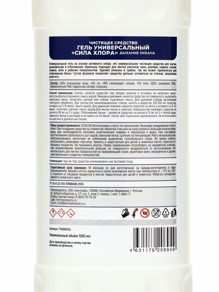 Универсальный гель "Сила Хлора" Hermes Industry HOME с ароматом "Дыхание океана" — это идеальный помощник в борьбе за чистоту вашего дома. Он превращает каждую уборку в процесс, который не только даёт ощущение идеальной чистоты, но и наполняет помещение свежестью океанского бриза. Независимо от того, нужно ли вам удалить стойкие загрязнения на кухне или очистить ванную комнату, этот гель справится с любой задачей. Ощутите силу хлора и наслаждайтесь безупречно чистыми поверхностями с Hermes Industry HOME.