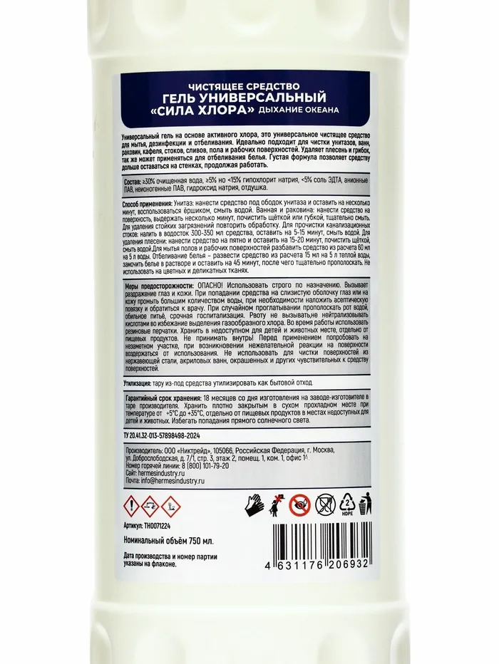 Универсальный гель "Сила Хлора" Hermes Industry HOME с ароматом "Дыхание океана", 750 мл — это мощное и универсальное средство для уборки, которое обеспечивает идеальную чистоту в вашем доме, справляясь с самыми сложными загрязнениями. Прекрасно подходящее для большинства поверхностей, оно эффективно удаляет жир, пятна, налёт и известковый налёт, а также обладает дезинфицирующими свойствами, оставляя ваш дом не только чистым, но и безопасным для здоровья.