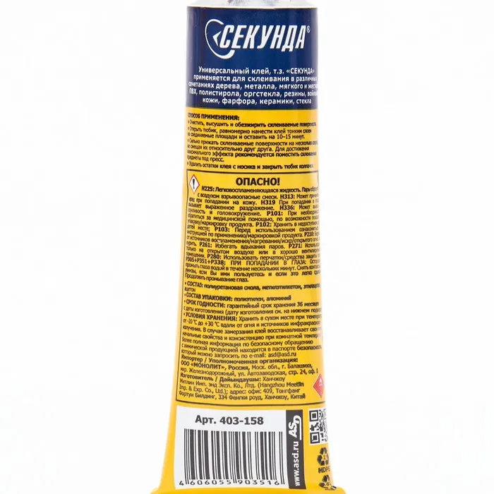 Универсальный клей Секунда 30 мл, прозрачный 403-108 способен выдерживать температуру до 80 °С.