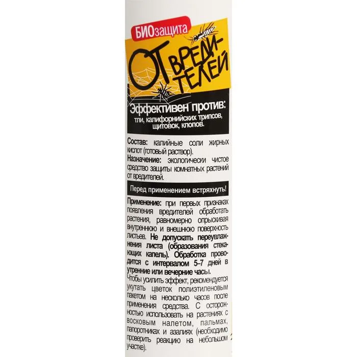 Состав: Содержит активные вещества, эффективно борющиеся с различными вредителями, такими как тля, трипсы, паутинные клещи и другие насекомые.