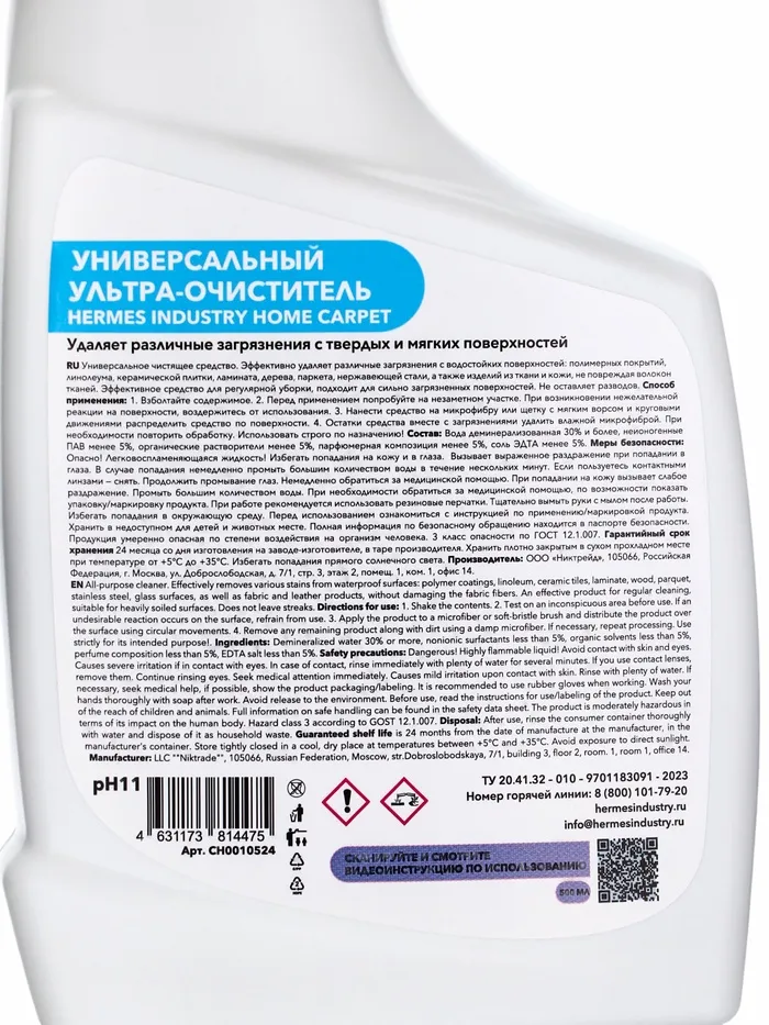 Hermes Industry HOME для ковров и мягкой мебели — это идеальный помощник для поддержания чистоты и уюта в вашем доме. С этим универсальным очистителем ваши ковры и мебель будут выглядеть как новые, а ваше пространство всегда будет наполнено свежестью. Удобное применение, отличные результаты и надежная защита — всё это делает Hermes Industry HOME незаменимым средством в вашем арсенале для чистоты и гигиены.