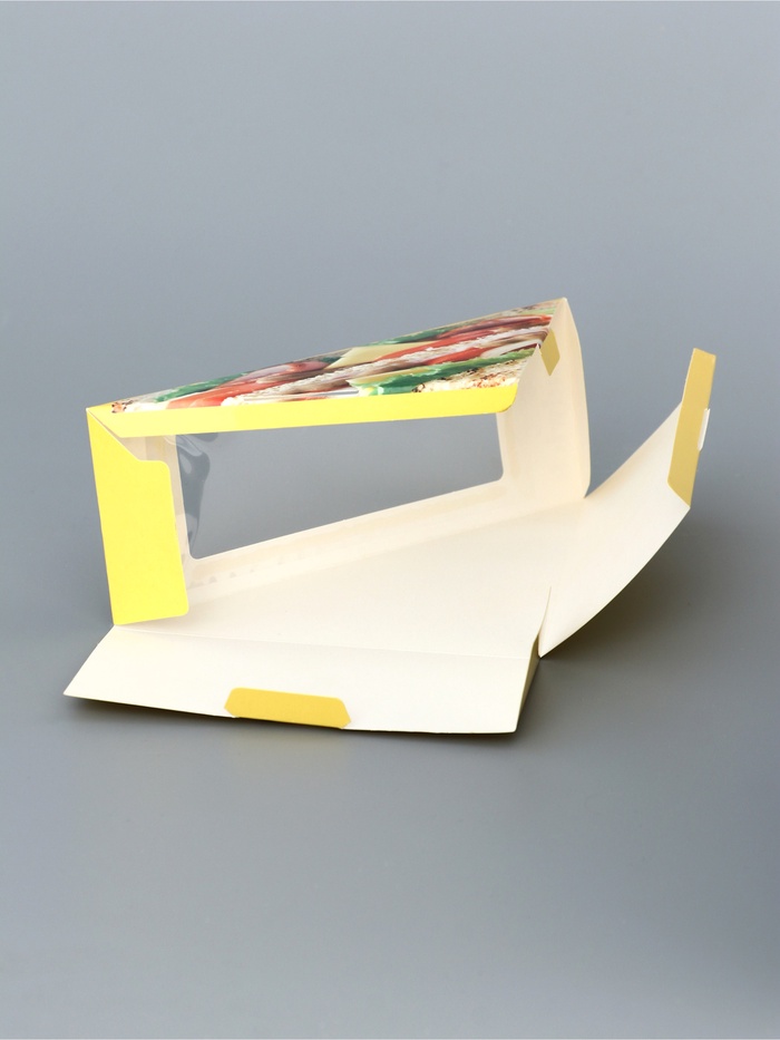 - PVC окно: Прозрачное окно из ПВХ позволяет видеть содержимое упаковки, не открывая её. Это особенно удобно для покупателей, которые могут оценить внешний вид сэндвича перед покупкой, а также для продавцов, контролирующих состояние продукции.