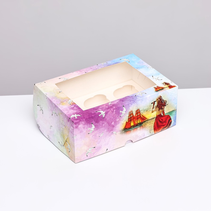 Упаковка на 6 капкейков с окном, «Алые паруса», 25×17×10 см
