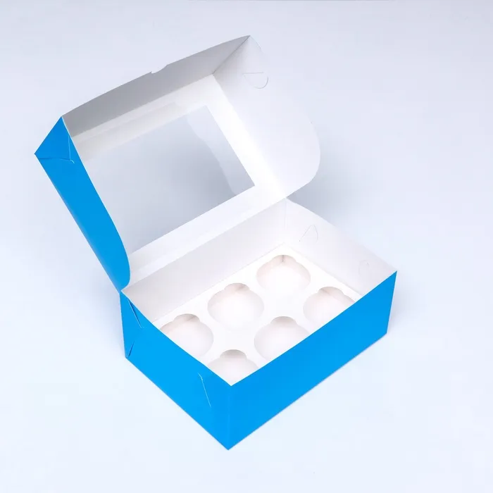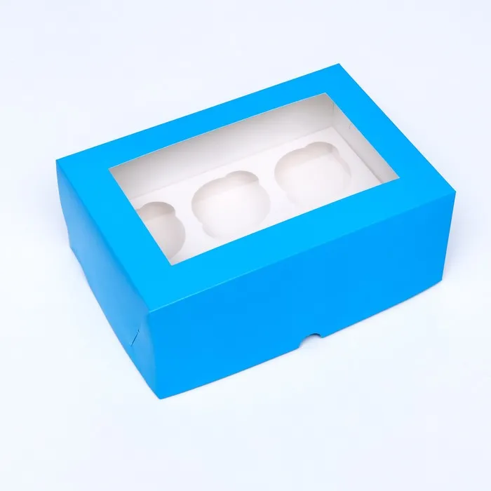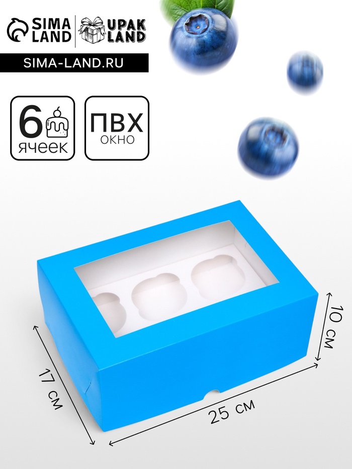 Упаковка на 6 капкейков с окном, голубая, 25×17×10 см — Характеристики