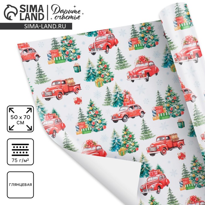 Упаковочная бумага на новый год «Машинка с подарками», 50 х 70 см, глянцевая
