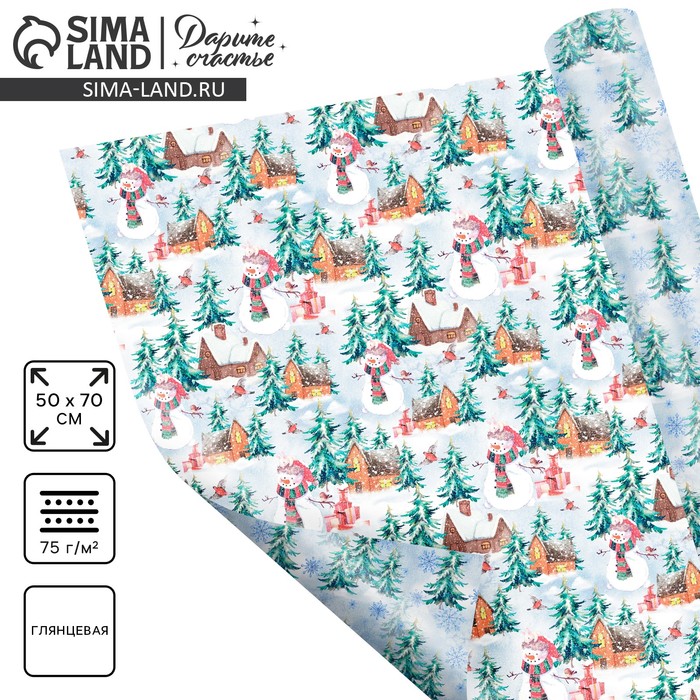 Упаковочная бумага на новый год глянцевая двухсторонняя «Зимняя деревушка», 50 х 70 см