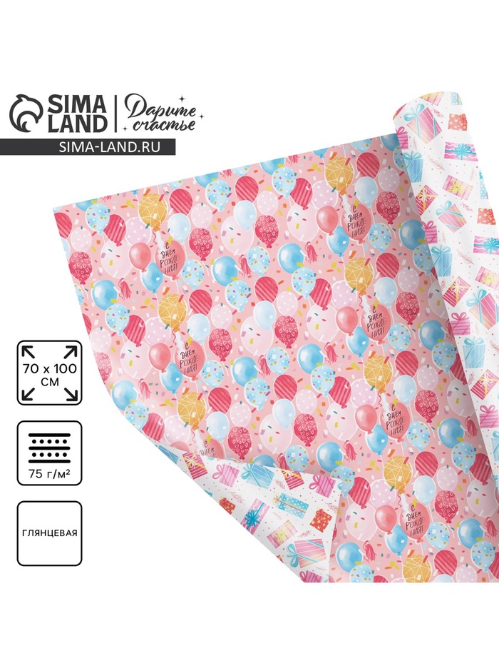 Бумага упаковочная глянцевая двухсторонняя «С Днём рождения», 70 х 100 см