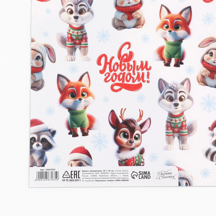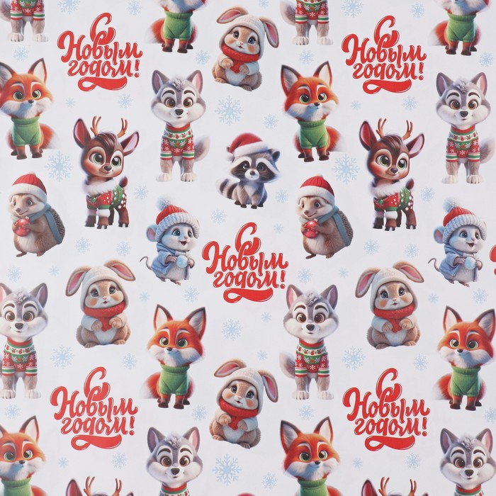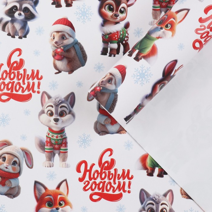 Упаковочная бумага на новый год «Новогодние зверушки», 50 х 70 см, глянцевая