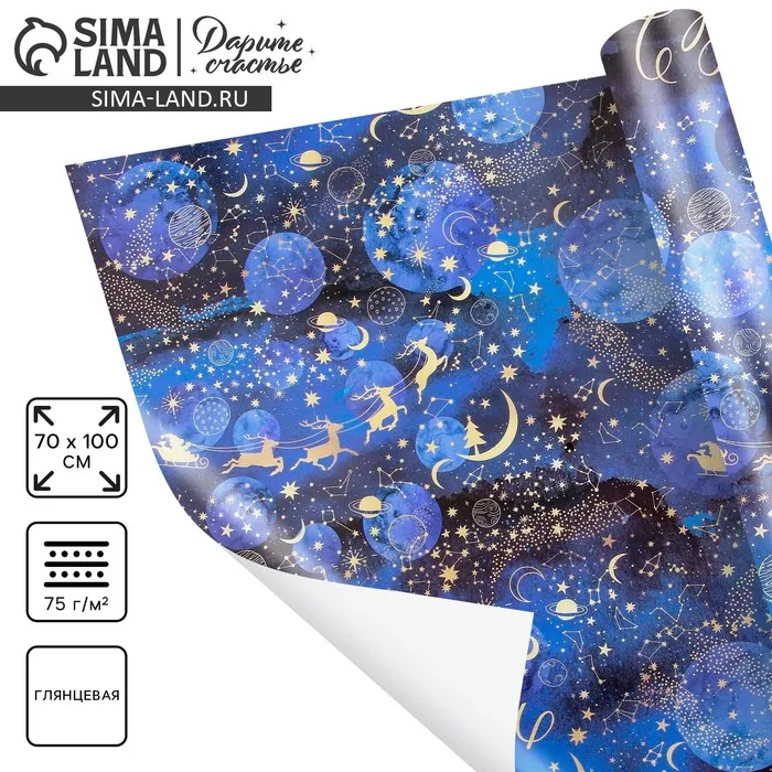Упаковочная бумага на новый год «Новогодний космос», 70 х 100 см, глянцевая — Характеристики