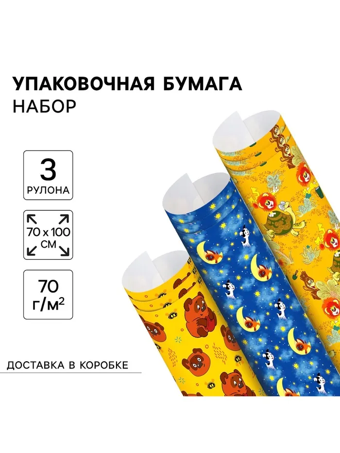 Упаковочная бумага, набор 3 листа, Винни Пух, Котёнок по имени Гав, Львёнок и Черепаха, 70 х 100 см