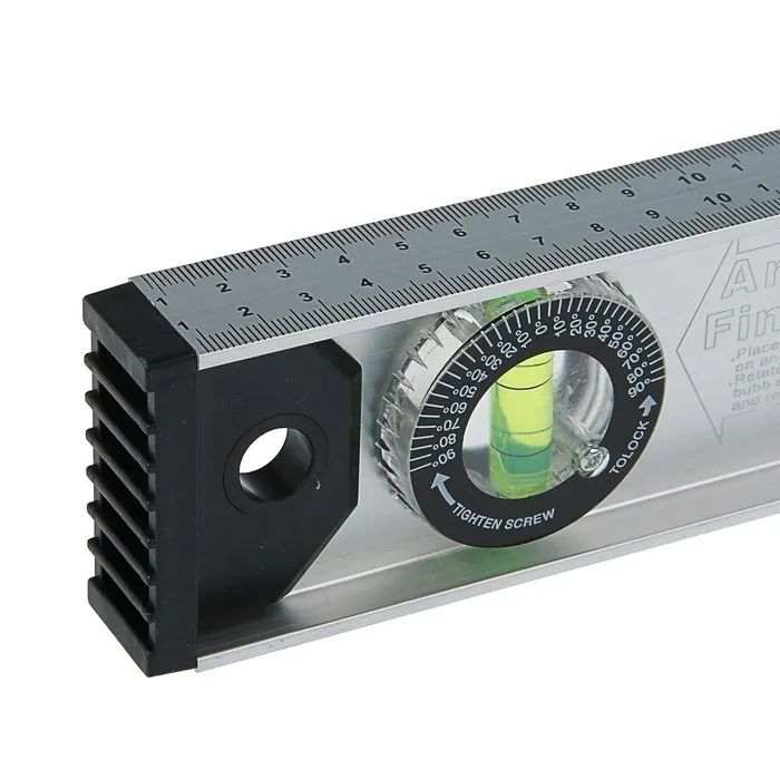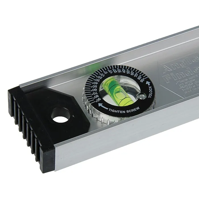 Изделие выполнено из алюминия, поэтому имеет небольшой вес. Поворотный глазок позволяет измерять угол наклона поверхности от 0 до 90°. Пластиковые заглушки защищают профиль от ударов при падении.