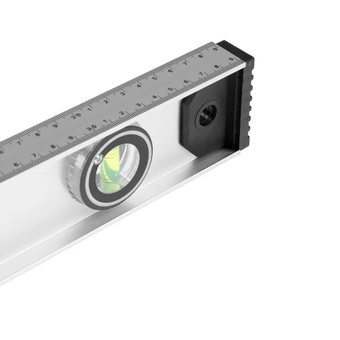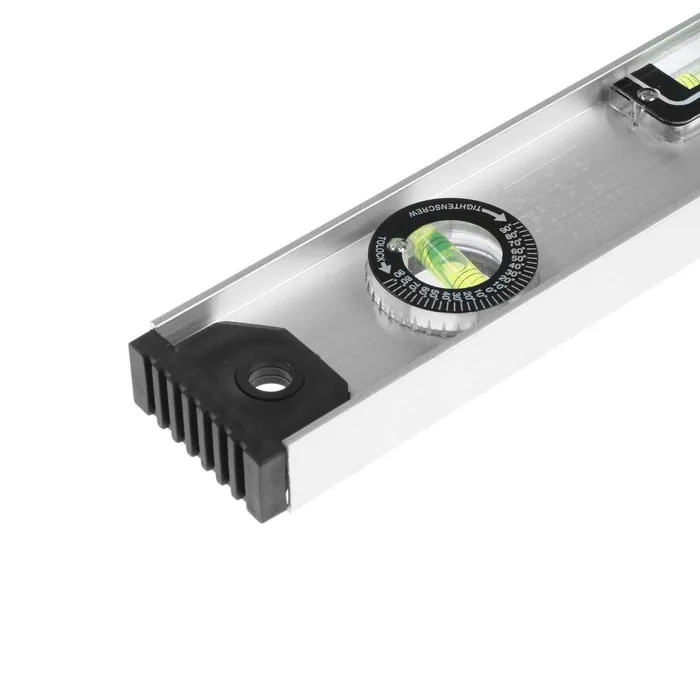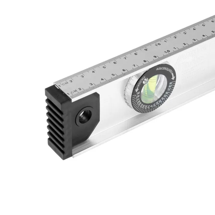 Изделие выполнено из алюминия, поэтому имеет небольшой вес. Поворотный глазок позволяет измерять угол наклона поверхности от 0 до 90°. Пластиковые заглушки защищают профиль от ударов при падении.