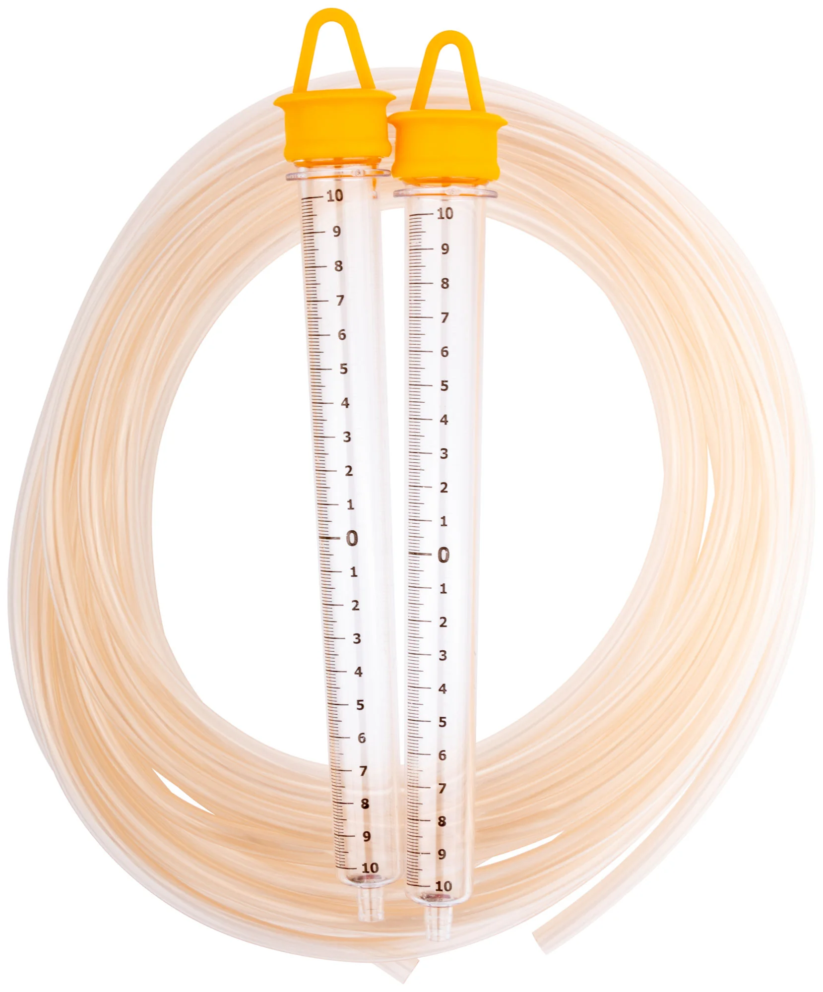 Уровень оснащен усиленной колбой с крашеной шкалой, что обеспечивает дополнительную надежность. Эластичный соединительный шланг повышенной прочности гарантирует долгий срок службы. Полная герметичность системы достигается за счет специальной конфигурации крышек.