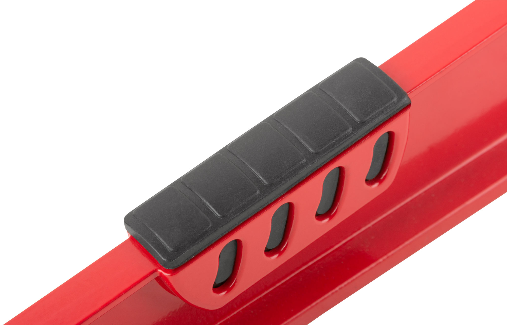 Изготовленный из алюминиевого сплава, уровень обладает прочной цельнометаллической конструкцией. Литой усиленный профиль и фрезерованная рабочая грань гарантируют долговечность и надежность. Прорезиненная ударная площадка позволяет использовать его в условиях строительства без риска повреждений.