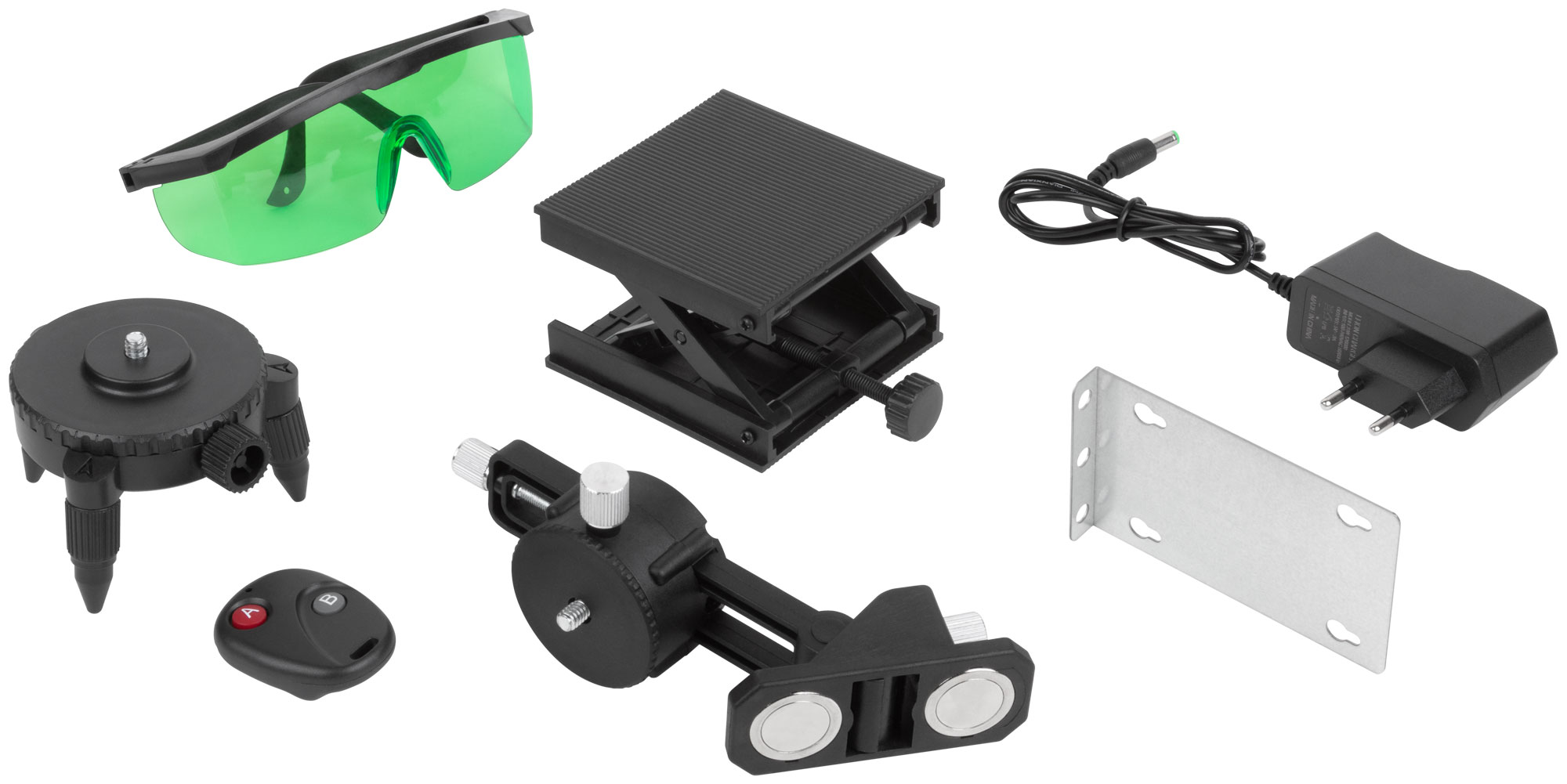 Изготовленный из ударопрочного ABS пластика и алюминиевого сплава, уровень отличается высокой надежностью. В комплекте идет множество полезных аксессуаров, включая пульт дистанционного управления и зарядное устройство.