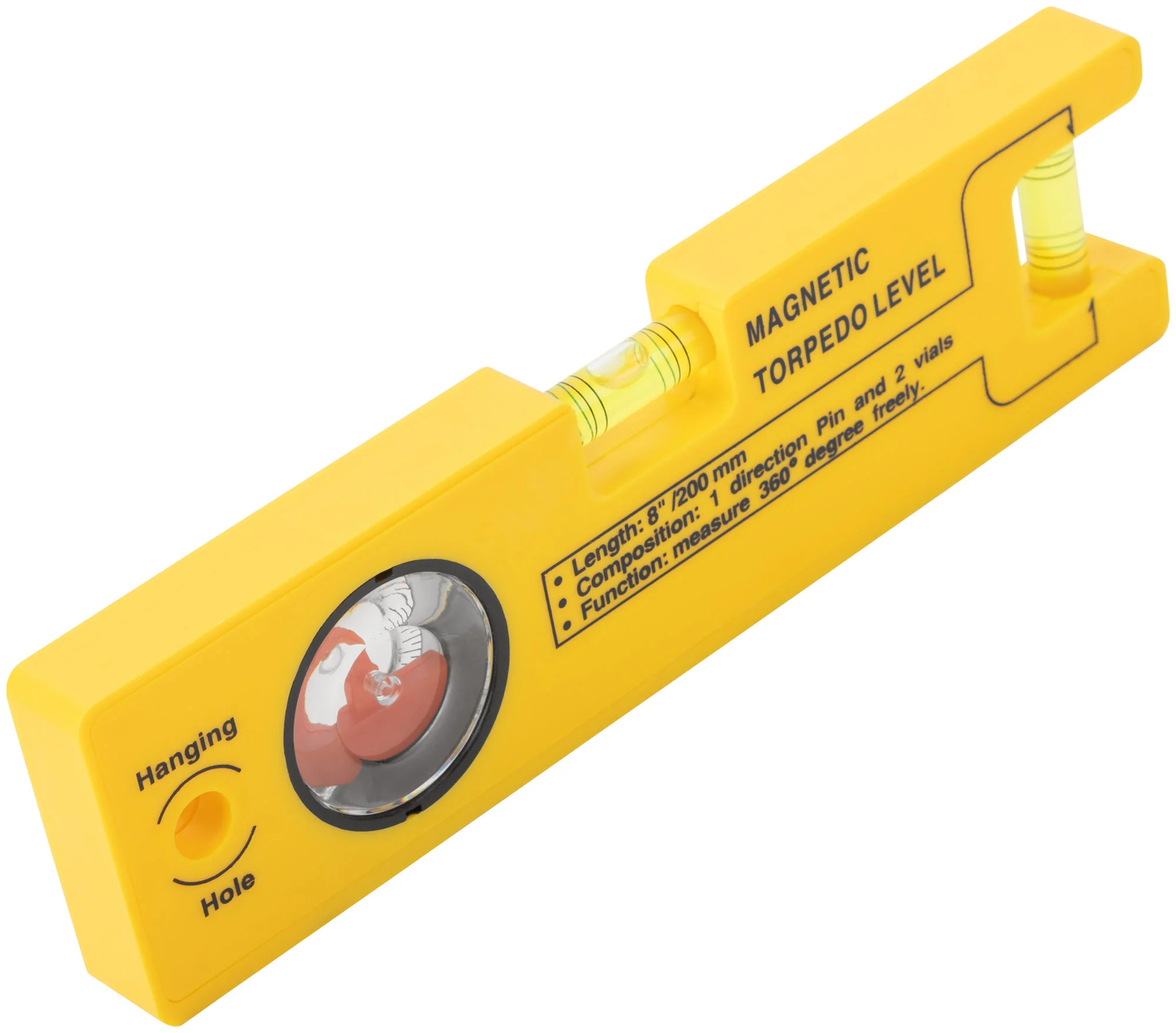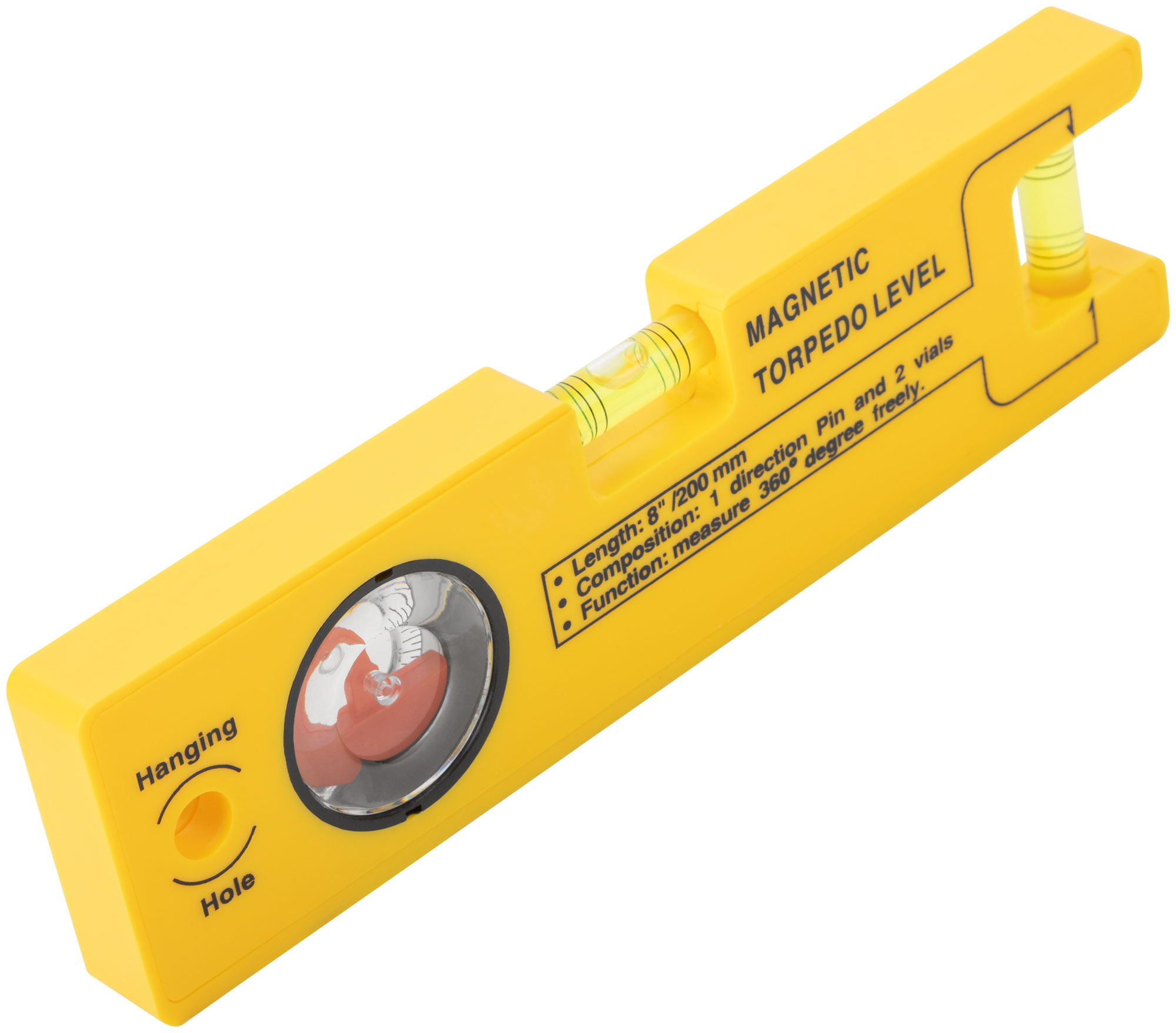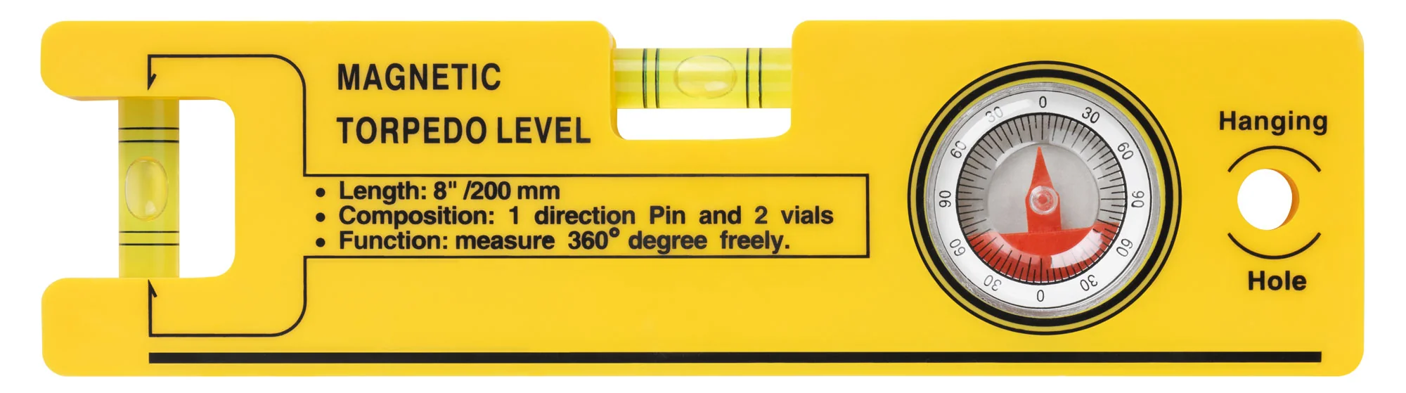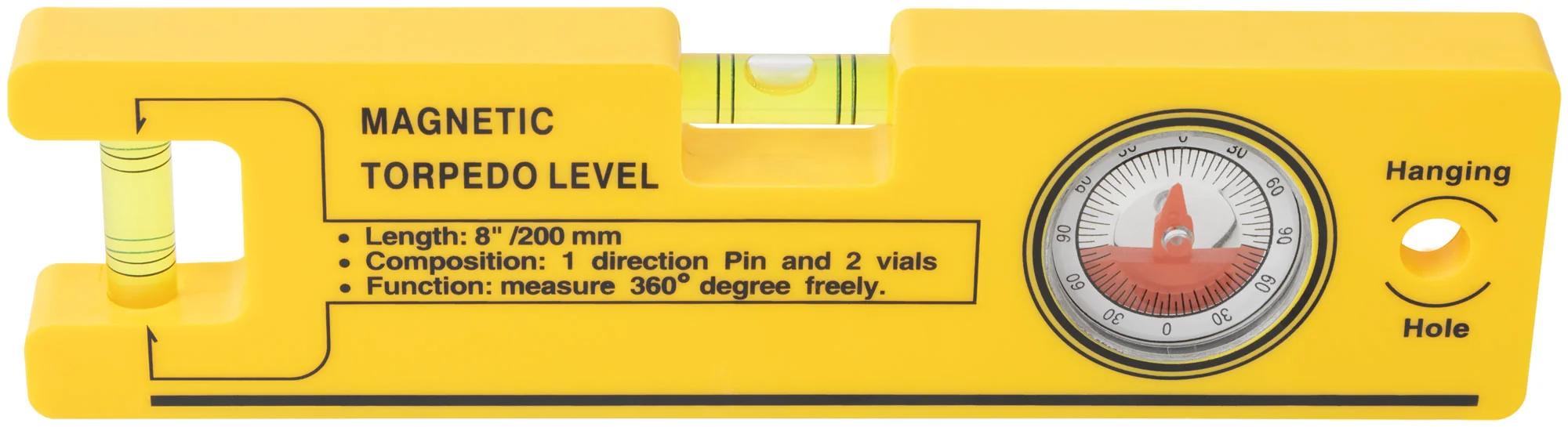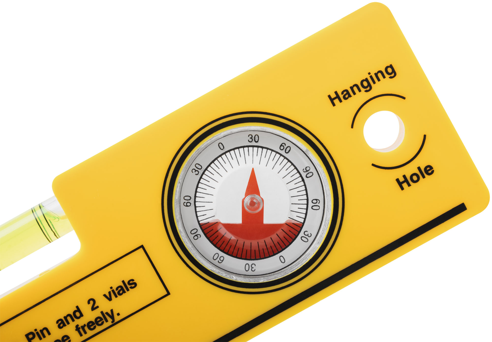 Корпус уровня изготовлен из прочного пластика и оснащен магнитным основанием, что обеспечивает удобство в работе. Два глазка обеспечивают повышенную точность измерений, а стрелочный угломер позволяет быстро определить нужный угол.