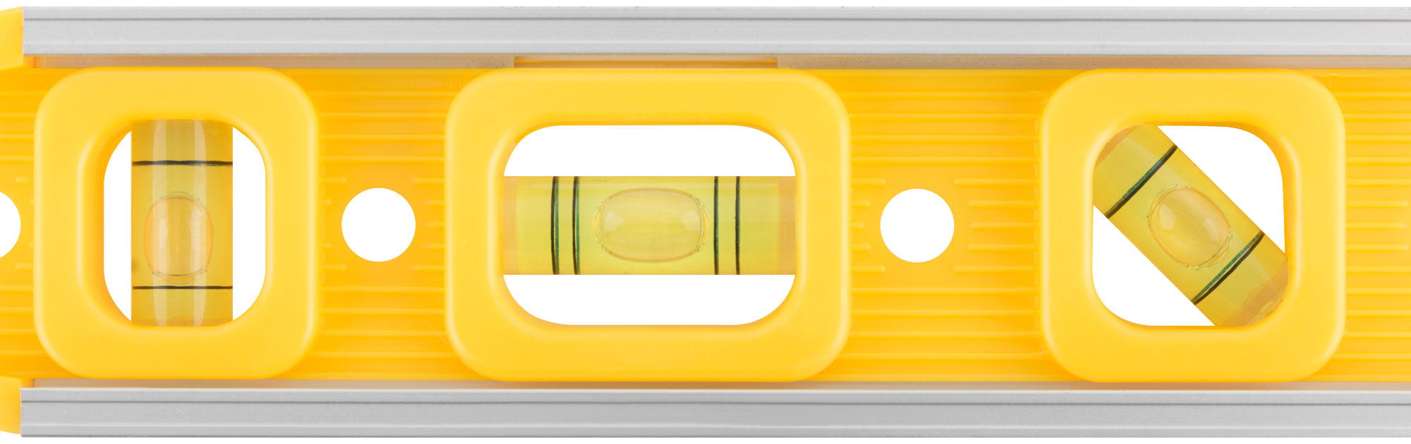 Корпус уровня выполнен из прочного пластика с алюминиевой рамкой, что обеспечивает долговечность и устойчивость к механическим повреждениям. Три глазка позволяют производить измерения в нескольких плоскостях, увеличивая функциональность инструмента.