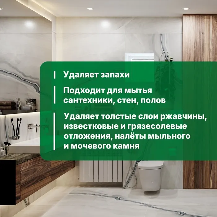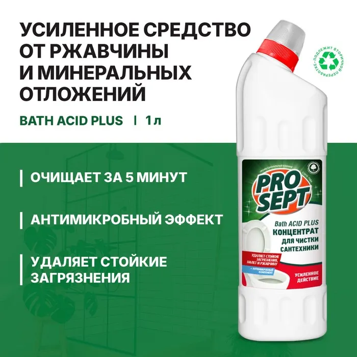Усиленное средство для ухода за сантехникой Prosept – состав на основе щавелевой кислоты эффективно очищает плотные слои ржавчины, известковые отложения, налеты мыльного и мочевого камня, грязесолевые и жировые отложения. Применяется для кислотостойких поверхностей – керамических, стеклянных, нержавеющей и хромированной стали и др.