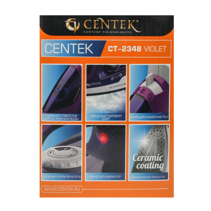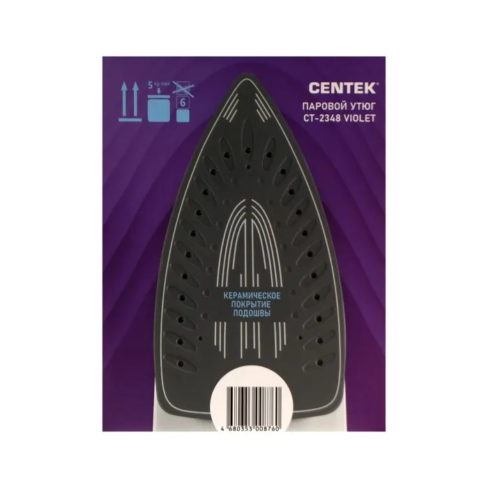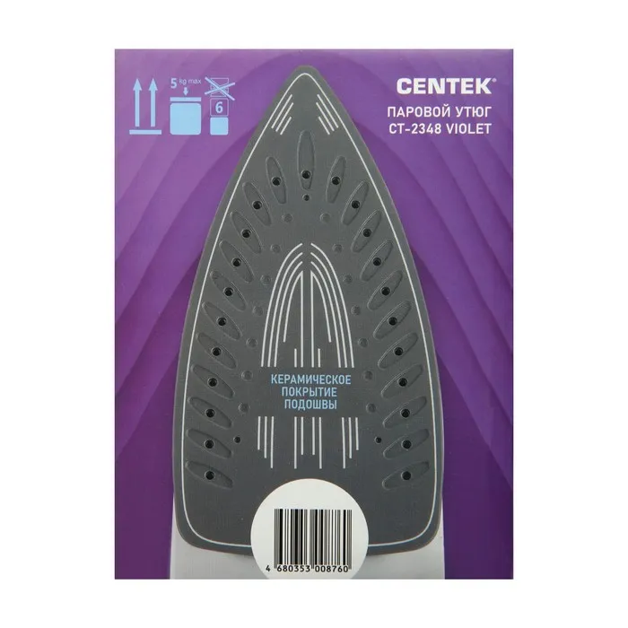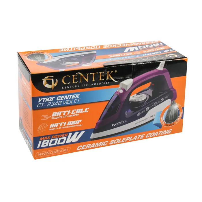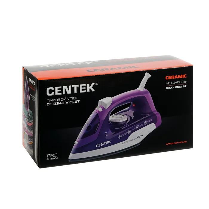 Утюг Centek СТ-2348 обеспечивает простое и эффективное глажение. Внутри корпуса расположен вместительный резервуар для воды объемом 200 мл, который дает возможность гладить с использованием пара, не отвлекаясь на долив жидкости. Режим постоянной подачи пара и паровой удар помогут вам справиться с самыми стойкими складками. Благодаря высокой мощности вы можете приступать к работе уже через несколько секунд после включения прибора. Мощность 1800 Вт обеспечивает большую подачу пара. Мощный выброс концентрированного пара обеспечивает быстрое и эффективное разглаживание таких сложных деталей, как манжеты, воротнички, область карманов, замков и пуговиц. Большой регулятор нагрева позволяет выбрать необходимую температуру для обработки типа ткани. Наличие шарового крепление упрощает эксплуатацию прибора. Распылитель образует мелкокапельный туман, равномерно увлажняющий ткань и облегчающий разглаживание складок. Узкий носик утюга прекрасно справится с разглаживанием труднодоступных мест возле пуговиц и мелких деталей.