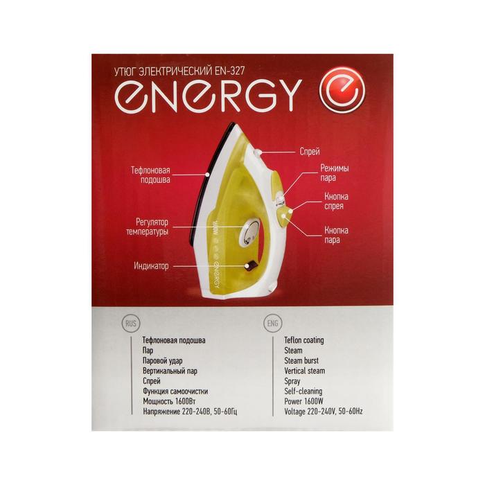 Утюг ENERGY EN-327, 1600 Вт, тефлоновая подошва, 170 мл, бело-жёлтый — Характеристики