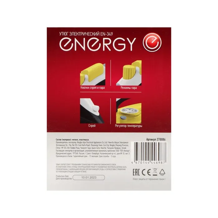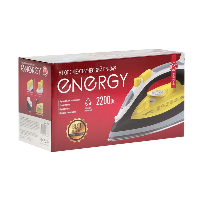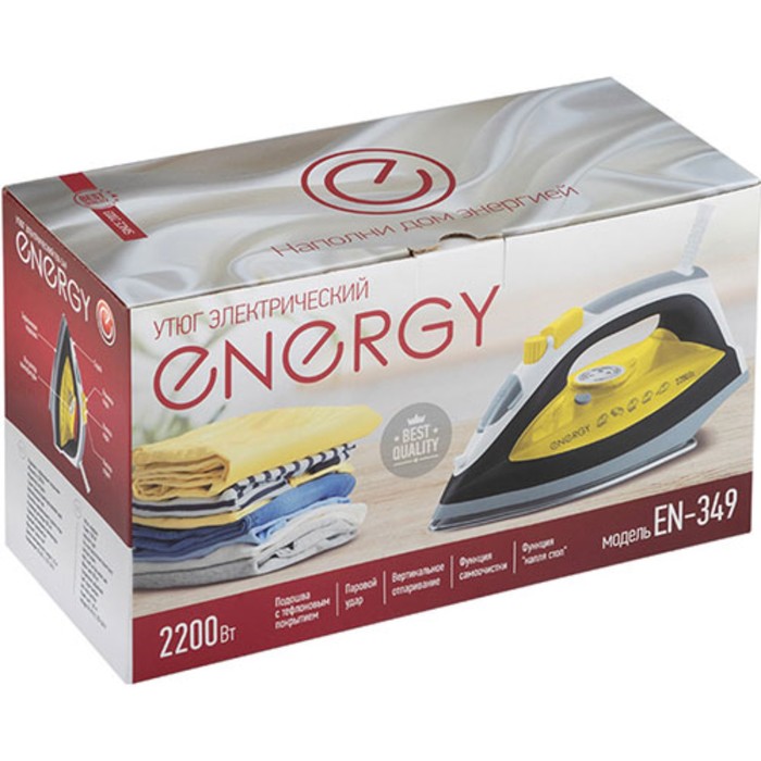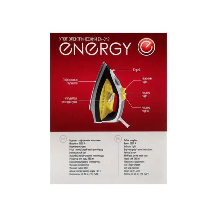 Утюг Energy EN-349, 2200 Вт, тефлоновая подошва, 330 мл, чёрно-жёлтый — Характеристики
