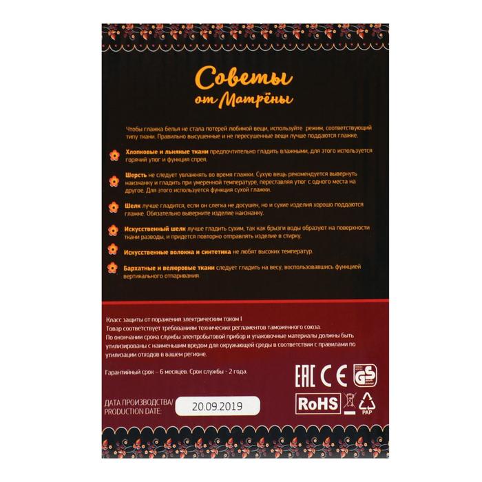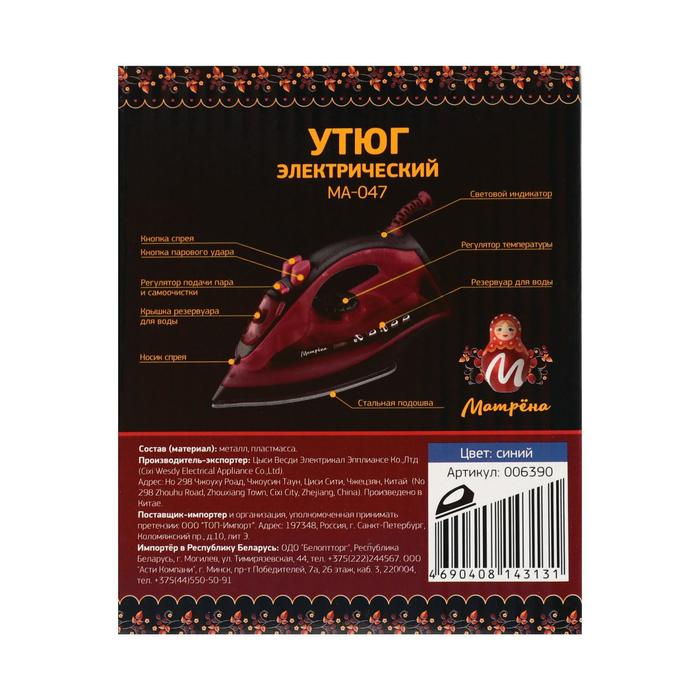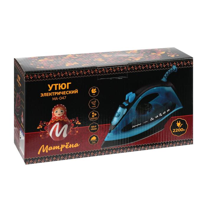 Утюг "МАТРЁНА" MA-047, 2200 Вт, стальная подошва, синий — Характеристики