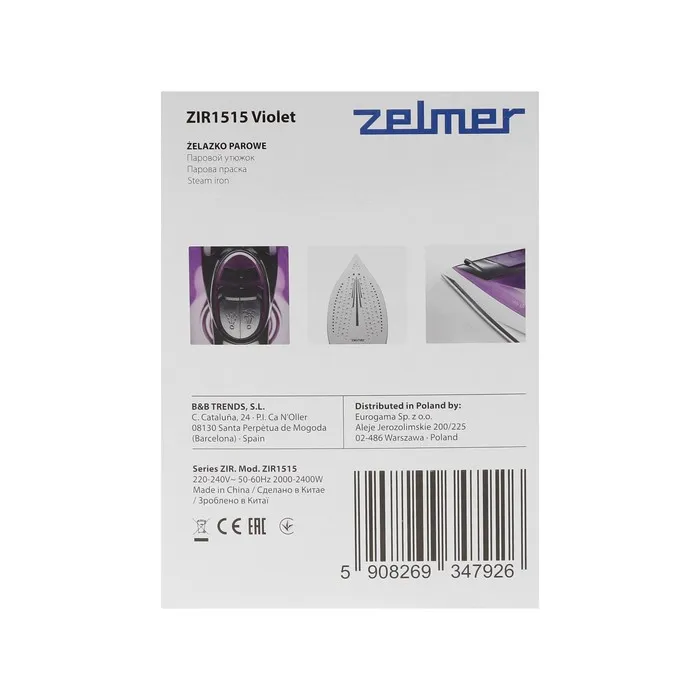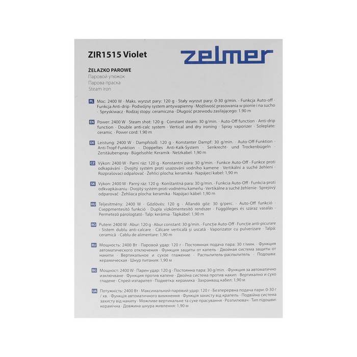 Утюг Zelmer ZIR1515 Violet, 2400 Вт, керамическая подошва, 30 г/мин, 240 мл, фиолетовый — Характеристики