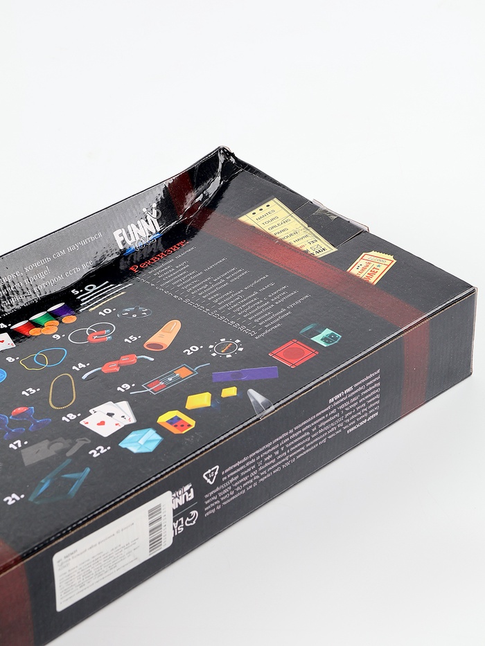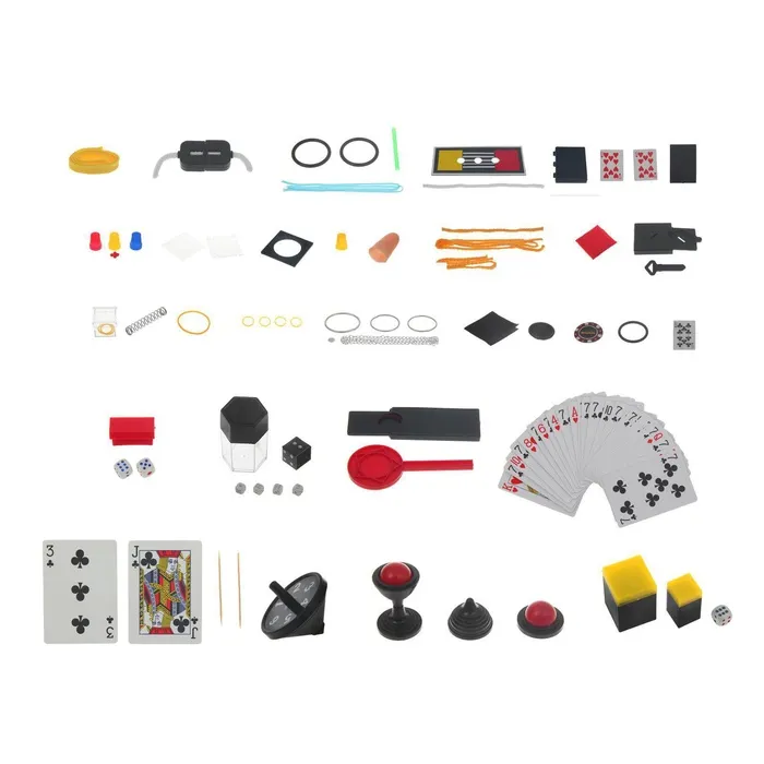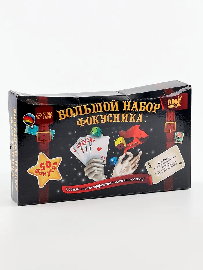 - 50 профессиональных фокусов. В набор входит всё необходимое для эффектных номеров. Каждый трюк сопровождается инструкцией, чтобы ребёнок быстро разобрался в механике.