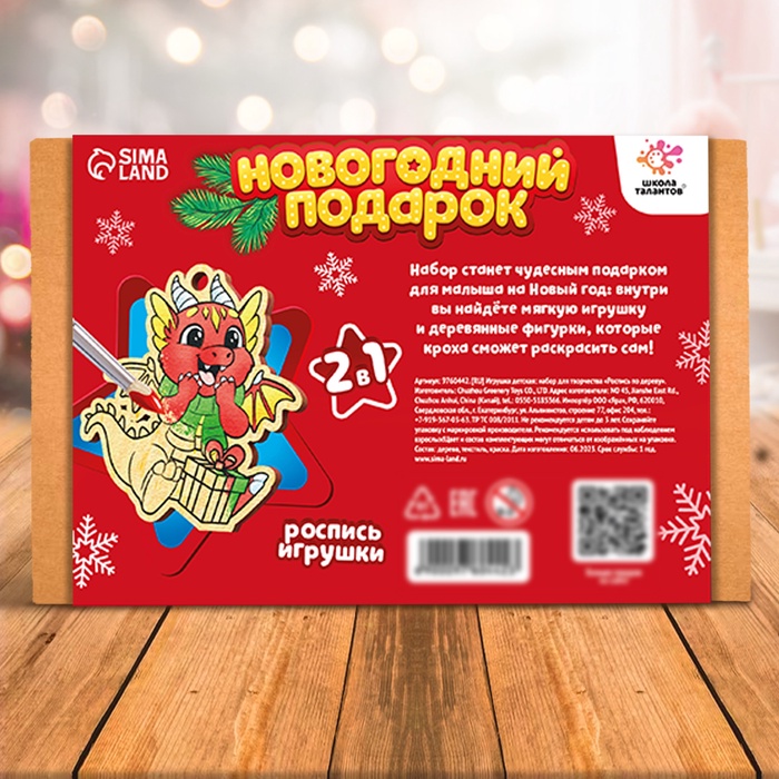 Подарите вашему ребёнку незабываемый праздник с новогодним подарком «Деревяшки + игрушка: Дракон». Этот набор включает в себя деревянные поделки для росписи и мягкую игрушку дракона. Деревянные детали легко собираются, а краски, входящие в комплект, позволят ребёнку проявить свою творческую натуру.