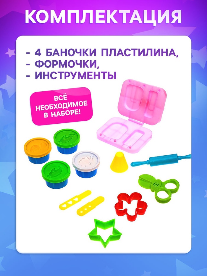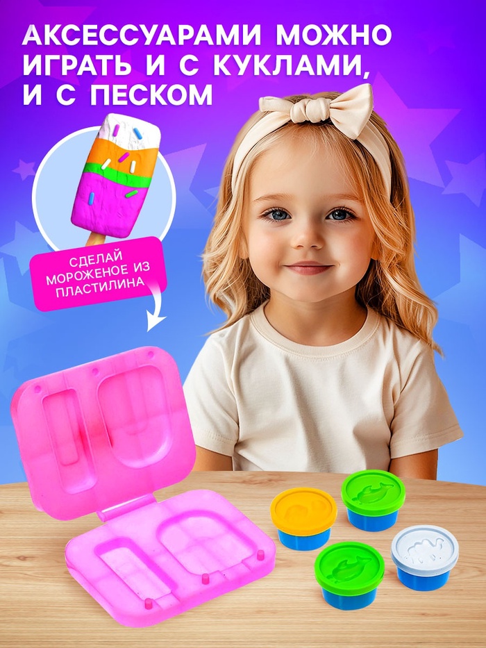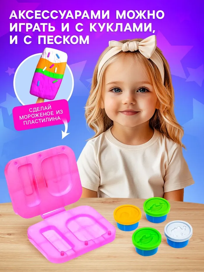 В наборы для творчества входит всё необходимое для лепки из пластилина. Вы найдёте интересные инструменты, формочки и разноцветную массу. Аксессуарами можно играть и с куклами, и с песком.