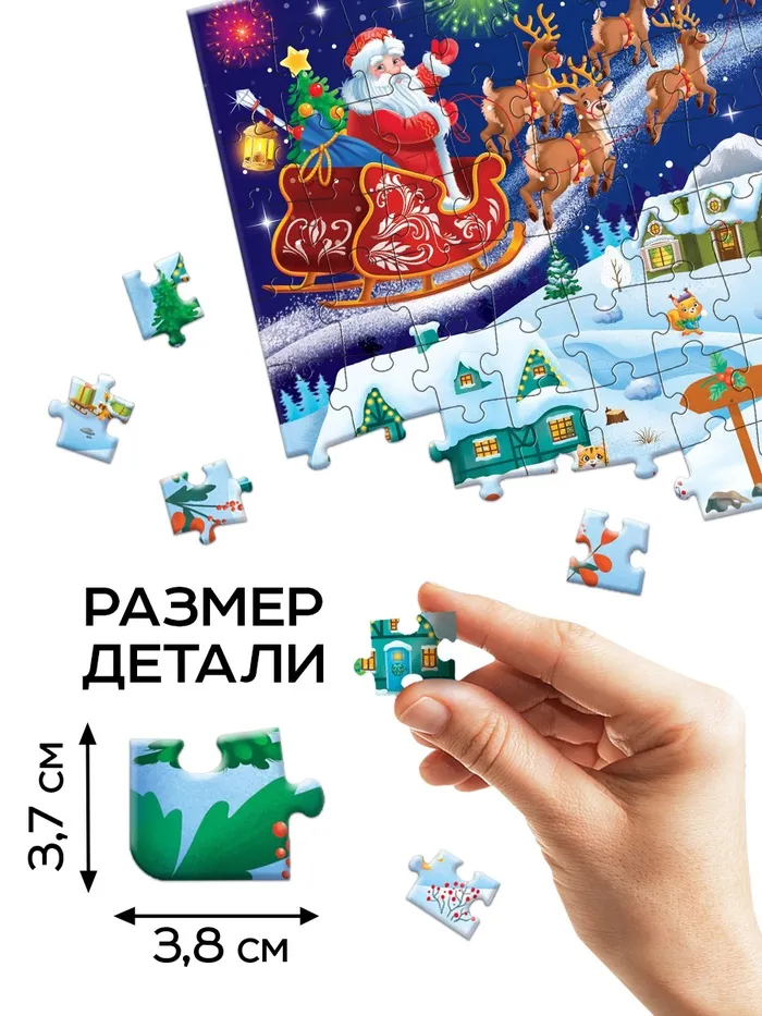 - Малыш соберёт все 88 детали в одно целое и получит красочный пазл с новогодним сюжетом.