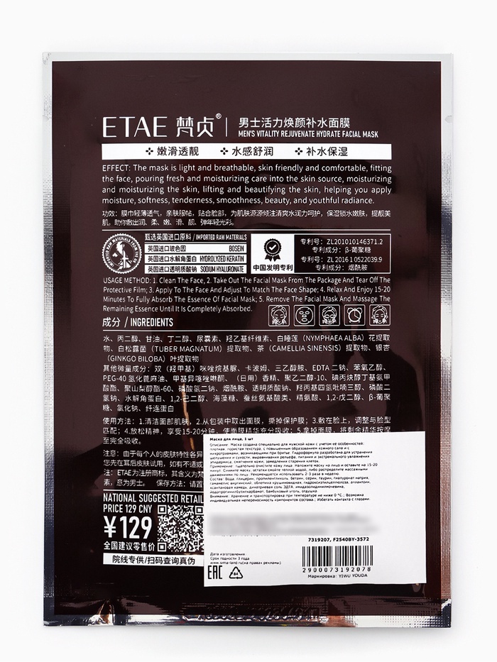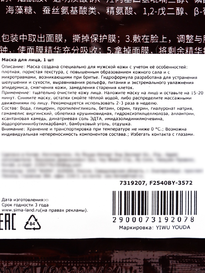 Маска создана специально для мужской кожи с учетом её особенностей: плотная, пористая текстура, с повышенным образованием кожного сала и с микротравмами, возникающими при бритье. Гидроформула разработана для устранения шелушения и сухости, выравнивания рельефа, питания и экстремального увлажнения эпидермиса, смягчения кожи, замедления старения клеток.